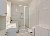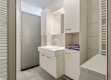 De badkamer is uitgerust met een wastafelmeubel, designradiator, aansluiting voor de wasmachine, douchecabine en een 2e toilet en is betegeld met witte gemarmerde wandtegels en witte vloertegels.