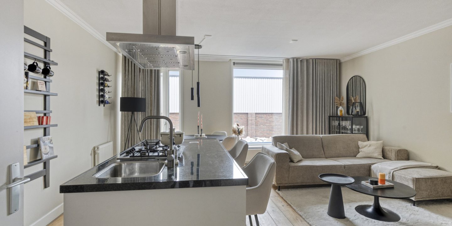 Het appartement biedt een lichte woonkamer met grote raampartijen en Frans balkon, een moderne keuken met kook- en spoeleiland, een comfortabele slaapkamer, een nette badkamer en een apart toilet. Met veel bergruimte blijft alles netjes en overzichtelijk.