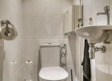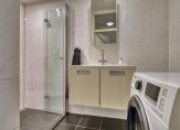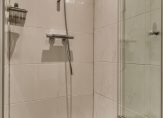 De keuken is voorzien van een inbouwkeuken met hoogglans witte fronten en een antracietkleurig gemêleerd kunststof aanrechtblad. Je hebt hier de beschikking over een oven, inductiekookplaat, recirculatiekap, vaatwasser, 1¼ spoelbak en een nis waarin je een koel-/vriescombinatie kunt plaatsen. De volledig betegelde badkamer is voorzien van een douche met glazen harmonicadeur, een wastafelmeubel, een spiegelkast, een aansluiting voor de wasmachine en een boiler (80 liter; deze is nieuw geplaatst in 2024). De wanden zijn afgewerkt met witte gemarmerde tegels (1 wand in de douche is betegeld met witte tegels) en op de vloer liggen antracietkleurige tegels. De toiletruimte is in dezelfde kleurstelling betegeld als de badkamer en is voorzien van een toilet en een fonteintje.