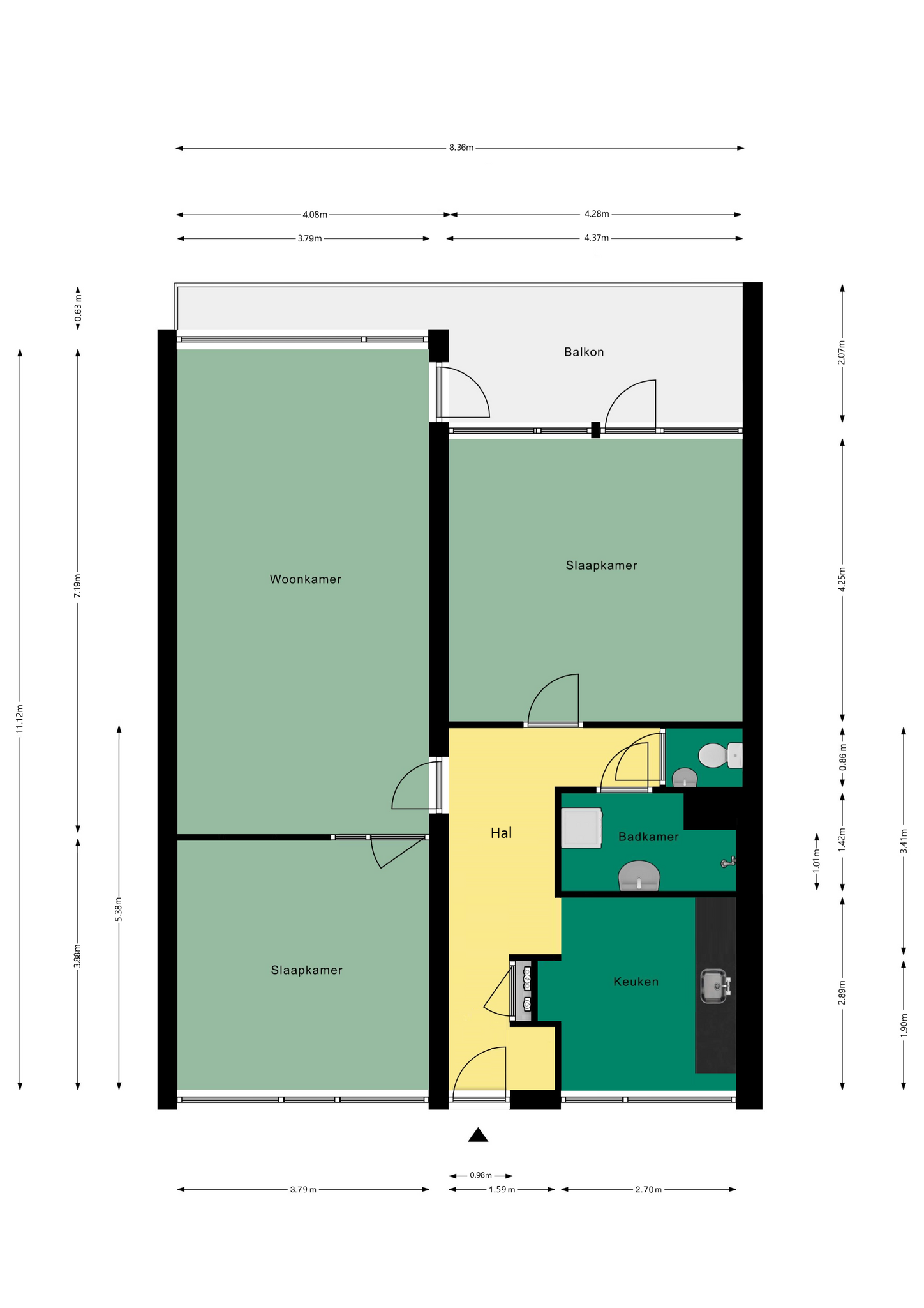 Achter de voordeur bevindt zich de ruime entreehal. Deze is voorzien van een praktische garderobenis, de meterkast en de videofooninstallatie. Vanuit de hal heb je toegang tot de keuken, badkamer, toiletruimte, woonkamer en de grootste slaapkamer.