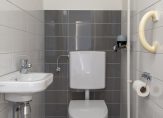 De toiletruimte is voorzien van een toilet en een fonteintje en is in dezelfde kleurstelling betegeld als de badkamer.