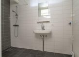 De volledig betegelde badkamer is voorzien van een wastafel met planchet en spiegel, een douchehoek en een aansluiting voor de wasmachine. De badkamer is afgewerkt met witte wandtegels (1 wand in de douche is afgewerkt met grijze tegels) en antracietkleurige vloertegels.