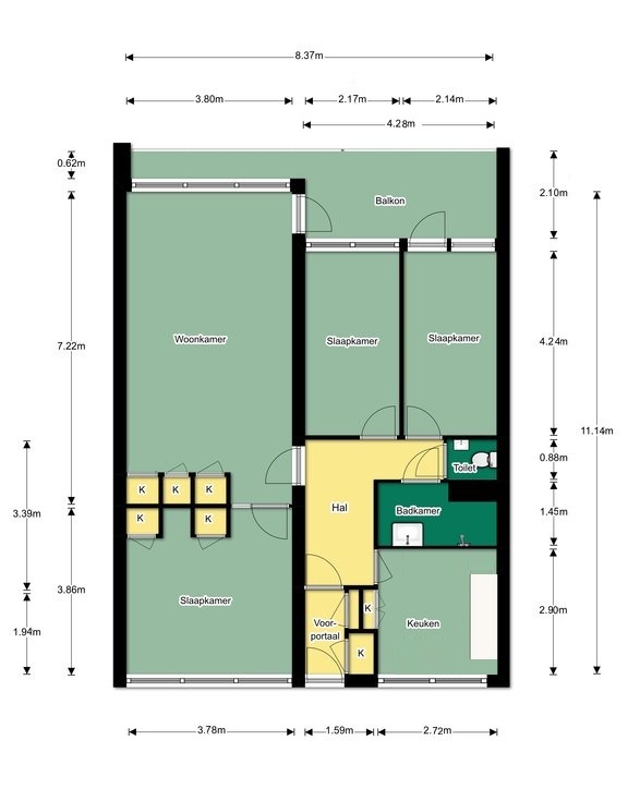 Achter de voordeur bevindt zich het voorportaal. Deze is voorzien van een voorraad-/bergkast en de meterkast. Een deur met glas leidt je naar de ruime L-vormige hal, waar je de intercom vindt en waarvandaan je toegang krijgt tot de keuken, badkamer, toiletruimte, 2 (van de 3) slaapkamers en de woonkamer.